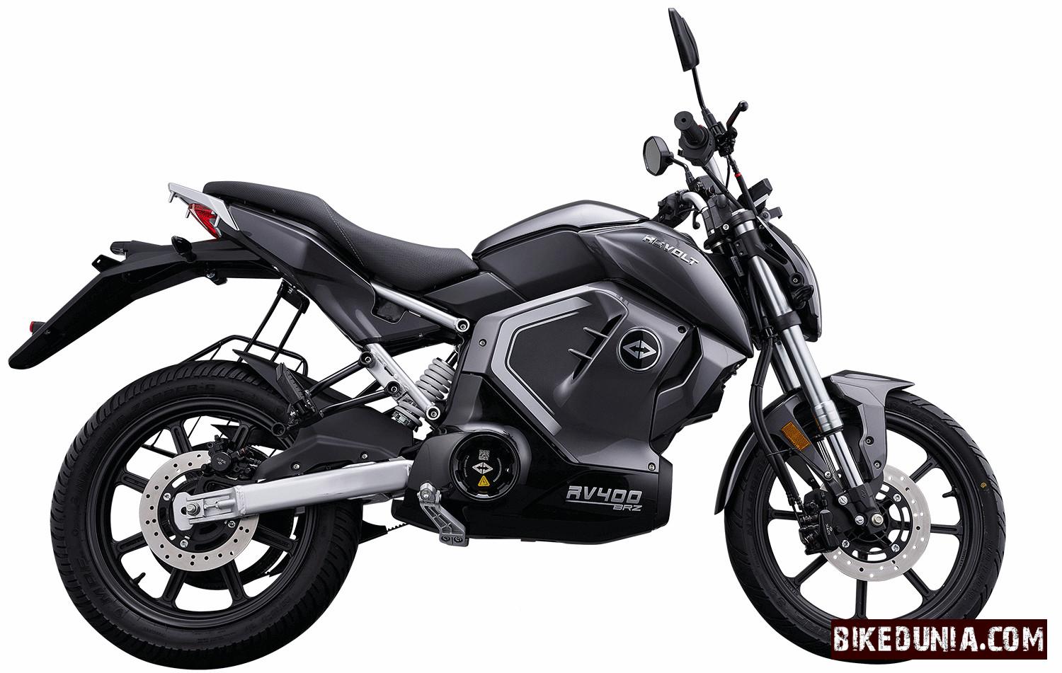 The Revolt RV400 BRZ is an electric motorcycle available in five colors: Dark Lunar Green, Dark Silver, Cosmic Black, Rebel Red, and Pacific Blue. It has a 3KW mid-drive motor and offers a range of 150 km in Eco Mode, 100 km in Normal Mode, and 80 km in Sports Mode, with a top speed of 85 km/h. The battery is a 72V, 3.24KWh Lithium Ion unit that charges fully in 4.5 hours. The bike features 240mm disc brakes on both front and rear, and it weighs 115 kg with a load capacity of 150 kg. Additionally, the RV400 comes with a 5-year or 75,000 km warranty for the vehicle and battery.