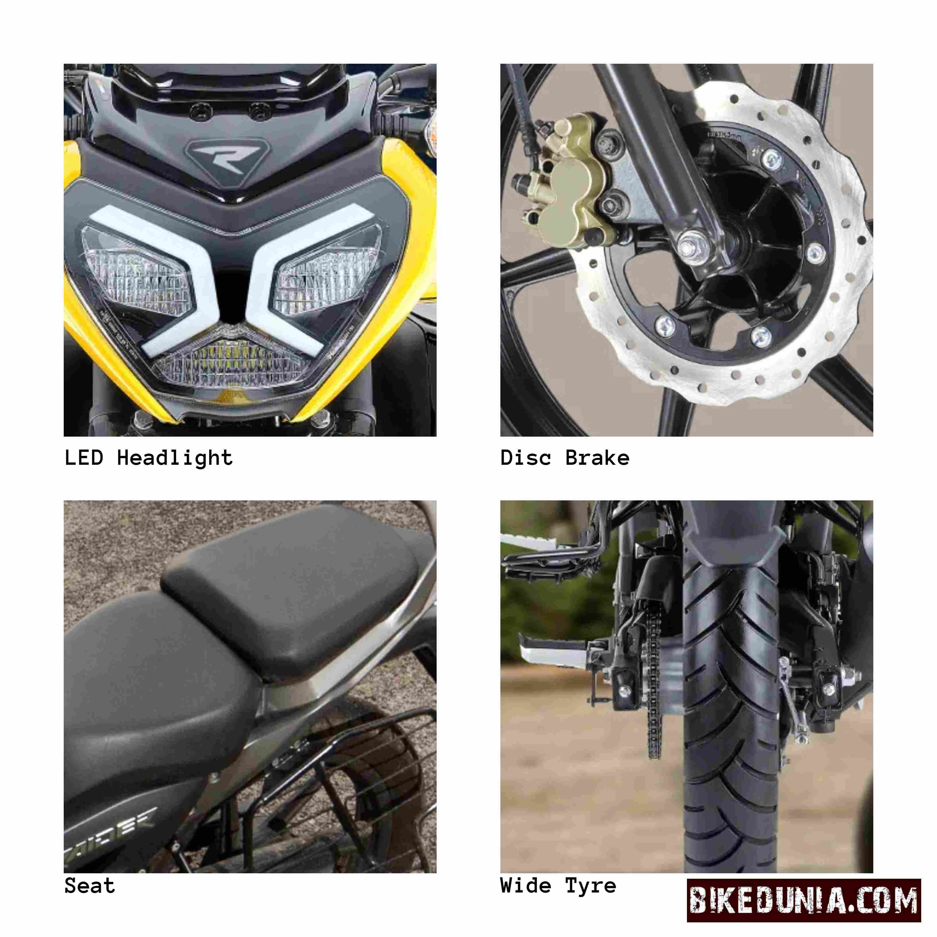 The TVS Raider SX is driven by a 124.8cc engine producing 11.4 hp and 11.2 Nm of torque. It has a 5-speed gearbox for smooth shifting and a digital console displaying essential information. Its lightweight body and low seat height make it agile and comfortable for city rides.